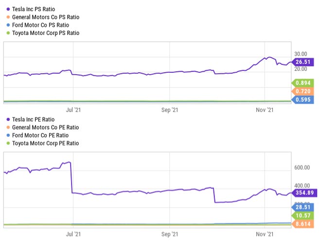 Dal grafico riportato qui di seguito, puoi vedere che Tesla non si avvicina lontanamente alla stessa stratosfera di General Motors, Ford o Toyota. Ci sono ragioni per questo, come il modello di auto-concessionaria di Tesla e il suo margine più alto, ma questa è una delle aziende più preziose al mondo ed è difficile vedere come il produttore di veicoli elettrici non abbia un prezzo per la perfezione, proprio come Rivian.