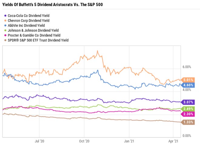 Nonostante queste nuove società, la stragrande maggioranza delle partecipazioni del Berkshire è in azioni con dividendi, principalmente nei settori finanziario e dei beni di consumo di base. Tuttavia, solo cinque dei 49 titoli detenuti dal Berkshire sono Dividend Aristocrats, membri dell'S&P 500 che hanno aumentato i loro dividendi per almeno 25 anni consecutivi. Si tratta di Coca-Cola, Chevron, AbbVie, Johnson & Johnson e Procter & Gamble.