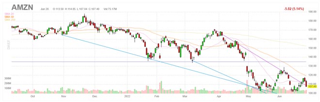 Nonostante la chiusura dell'ultima sessione leggermente al di sotto della SMA a 20 giorni, le azioni Amazon devono ancora superare la linea di supporto di 101 dollari, probabilmente indicando che il trading range compreso tra i 128 e i 101 dollari continuerà a valere e le azioni rimarranno range-bound per un po' di tempo.