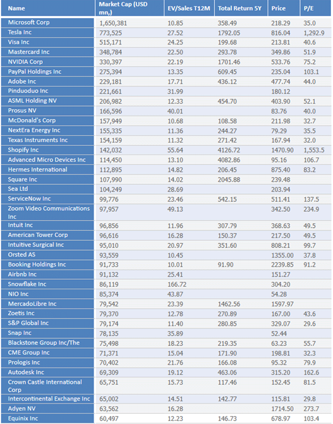 La tabella seguente mostra le società statunitensi ed europee con un valore di mercato superiore ai 10 miliardi di dollari che hanno il rapporto EV/Sales più elevato (in ordine in base alla capitalizzazione di mercato). La lista comprende molte azioni ben note, appartenenti principalmente al settore tecnologico, ma sono presenti anche alcune azioni green.