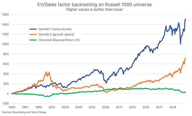 Come mostra il backtest sul Russel 1000, le azioni con basso EV/Sales (value stock) generalmente registrano una performance migliore rispetto a quelle con alto rapporto EV/Sales (growth stock). Tuttavia, dal 2014 le prime hanno drammaticamente sotto-performato in quanto gli investitori hanno progressivamente puntato sulle growth stock come conseguenza del crollo dei tassi di interesse.