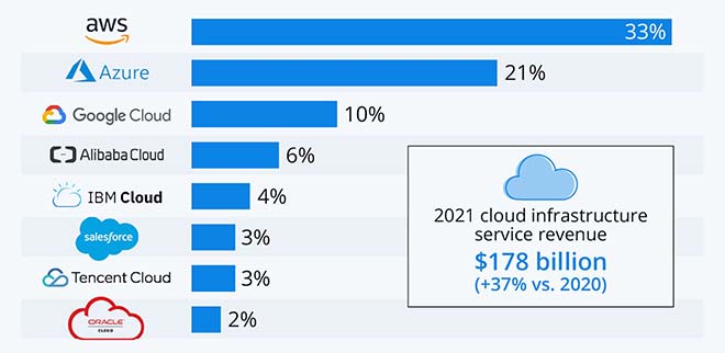 Microsoft ha originariamente costruito l'azienda sulla sua posizione dominante nei sistemi operativi per PC. Ma con il declino dell'importanza del PC, è passato al cloud computing con Azure sotto il CEO Satya Nadella. Azure è lo sfidante più importante per AWS di Amazon e comprende oltre 200 prodotti e servizi. Questo cambio di strategia ha permesso di raggiungere una capitalizzazione di mercato di 2 trilioni di dollari, rendendola la seconda società più grande scambiata sulle borse statunitensi dopo Apple.