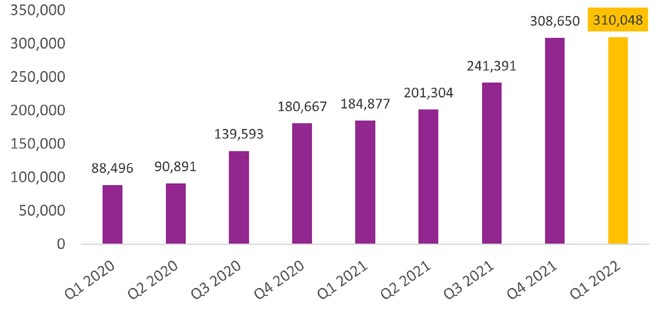 Le nuove fabbriche porteranno la capacità di produzione di Tesla a 2 milioni di veicoli all'anno da 1,05 milioni in precedenza. Sfortunatamente, l'azienda deve ancora fare i conti con i problemi della catena di approvvigionamento di materie prime e componenti come i semiconduttori , che è un problema che tutte le case automobilistiche devono attualmente affrontare. Ma una volta risolto (e lo farà), il grafico sottostante dovrebbe continuare a mostrare un forte aumento delle consegne.