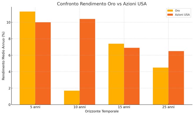 | Periodo Analizzato | Rendimento Medio Oro | Rendimento Medio Azioni USA |