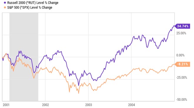 C'era uno scenario leggermente diverso nel nuovo mercato rialzista precedente a quello successivo alla Grande Recessione. Il Russell 2000 ha resistito meglio dell'S&P 500 durante la flessione del mercato verificatasi durante e dopo la recessione del 2001.