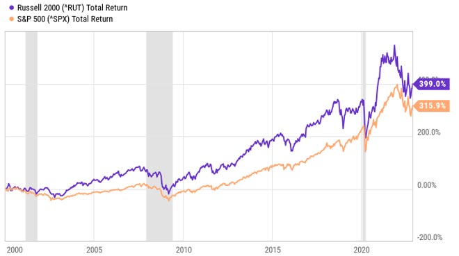 La linea di fondo è che le azioni a bassa capitalizzazione possono potenziare il tuo portafoglio. A lungo termine, sovraperformano le azioni a grande capitalizzazione. Basta guardare il confronto dei rendimenti totali del Russell 2000 e dell'S&P 500 dal 2000.