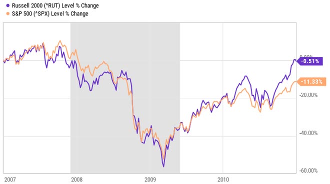 Si noti nel grafico sottostante come il Russell 2000 abbia seguito da vicino la performance dell'S&P 500 a grande capitalizzazione durante gran parte della massiccia svendita del mercato durante la Grande Recessione che è iniziata alla fine del 2007 e si è protratta fino alla metà del 2009 (la parte ombreggiata del grafico indica quando l'economia statunitense era in recessione).