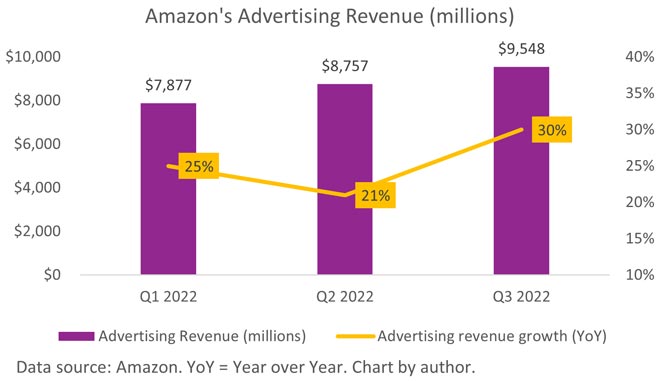 L'industria dello streaming sta vivendo un passaggio ai contenuti supportati dalla pubblicità, anche su Netflix, che è uno dei servizi dominanti. Nel tempo, Amazon sarà probabilmente in grado di monetizzare più risorse attraverso gli annunci, ma anche in questa fase, nel recente trimestre (terminato il 30 settembre), il business pubblicitario dell'azienda è cresciuto finora al ritmo più veloce del 2022.