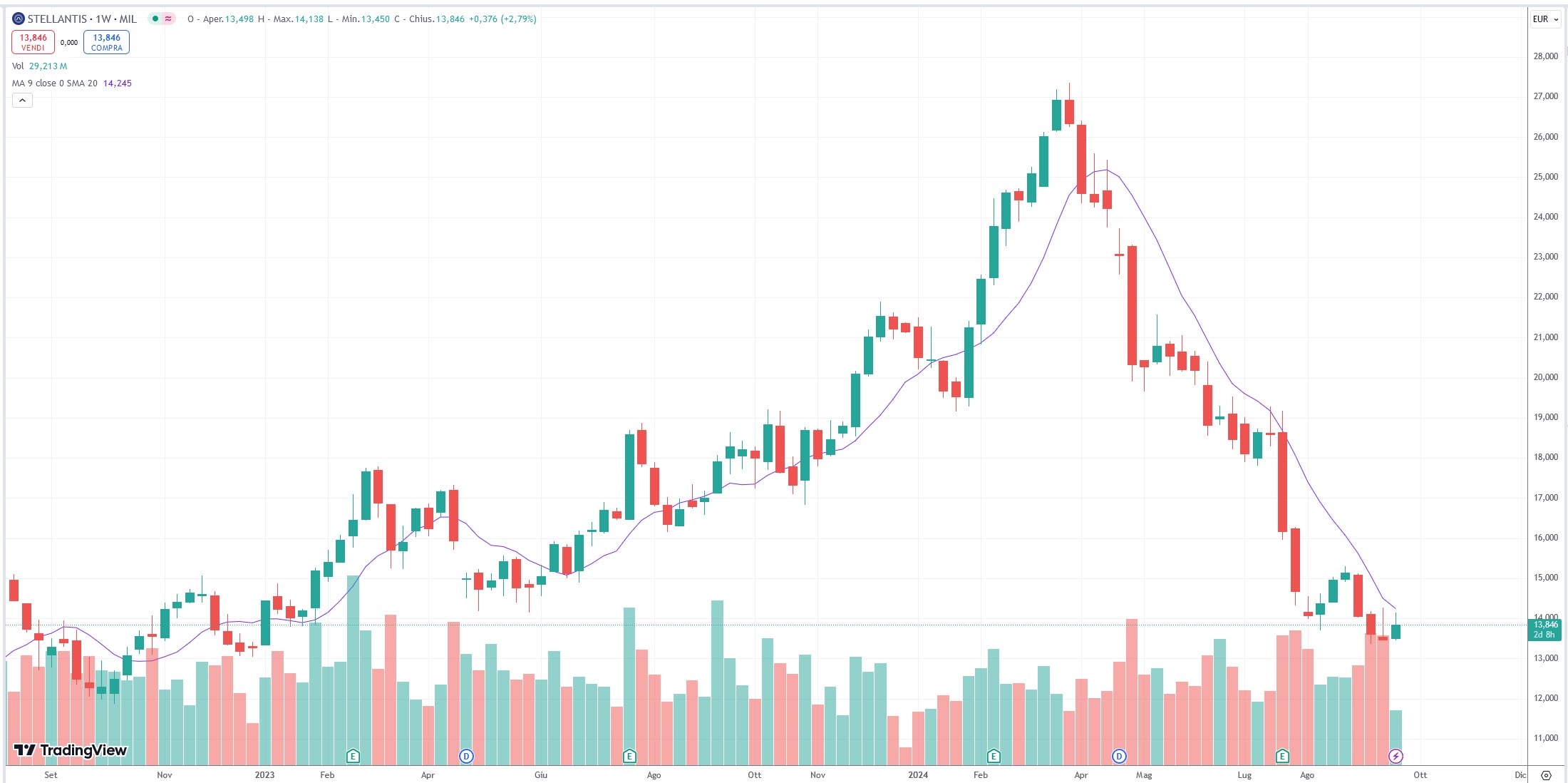 Dal punto di vista tecnico, osservando il grafico settimanale, emerge che Stellantis ha costruito una solida base di supporto intorno a livelli chiave. Nonostante non si possa ancora parlare di una completa inversione del trend ribassista, il mercato mostra segnali di consolidamento che potrebbero preludere a un rimbalzo nel breve termine.