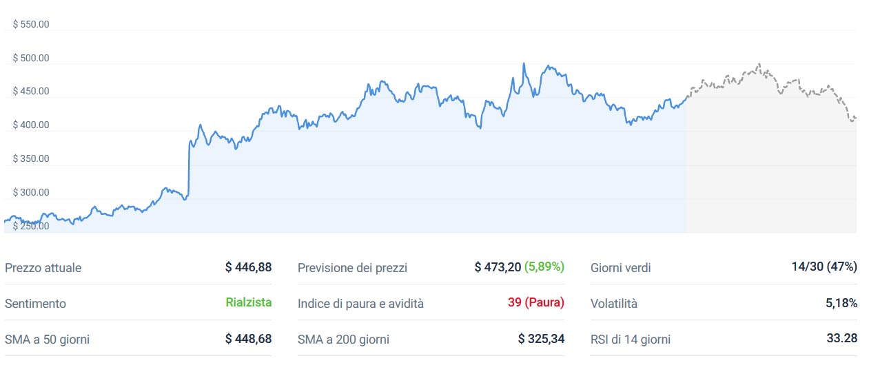 Secondo le attuali previsioni su azioni NVDA, il valore delle azioni Nvidia aumenterà del 5,89% e raggiungerà i 473,20 dollari per azione entro l’11 ottobre 2023 . Secondo gli indicatori tecnici di CoinCodex, il sentimento attuale è rialzista mentre l’indice Fear & Greed mostra 39 (Fear). Il titolo NVDA ha registrato 14/30 (47%) giorni verdi con una volatilità dei prezzi del 5,18% negli ultimi 30 giorni. Sulla base delle previsioni sulle azioni Nvidia riportate da CoinCodex, ora è un buon momento per investire in azioni Nvidia perché vengono scambiate al di sotto del 5,56% rispetto alle previsioni.
