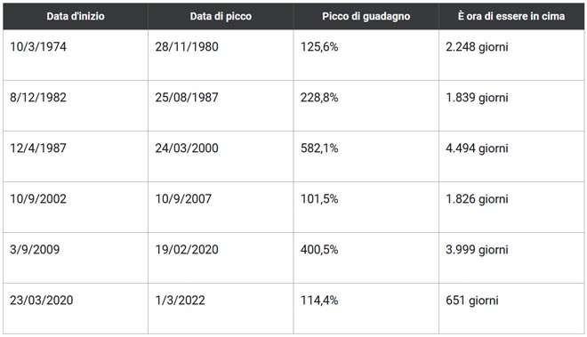 Per costruire un quadro completo dei cicli di mercato passati, gli investitori dovrebbero anche considerare i mercati rialzisti degli ultimi cinque decenni. Il grafico seguente mostra la data di inizio (notare che queste sono le stesse delle date di minimo elencate sopra), la data di picco, il picco di guadagno e il numero di giorni necessari all'S&P 500 per raggiungere il massimo.