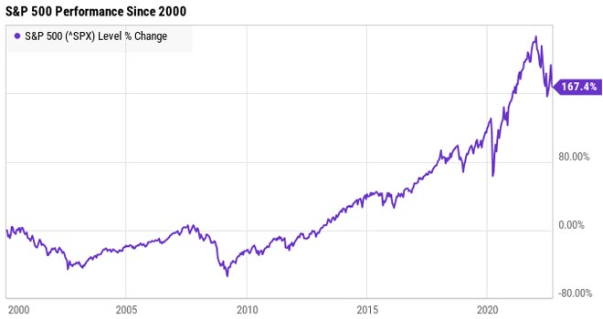 Se osserviamo il mercato azionario americano, solo negli ultimi due decenni, il mercato ha visto scoppiare la bolla delle dot-com, la Grande Recessione, il crollo del COVID-19 nel marzo 2020 e decine di correzioni minori e crolli nel mezzo. Nonostante tutto, tuttavia, l'indice S&P 500 ha registrato rendimenti superiori al 167% in quel lasso di tempo. Lo si può vedere nel grafico qui sotto: