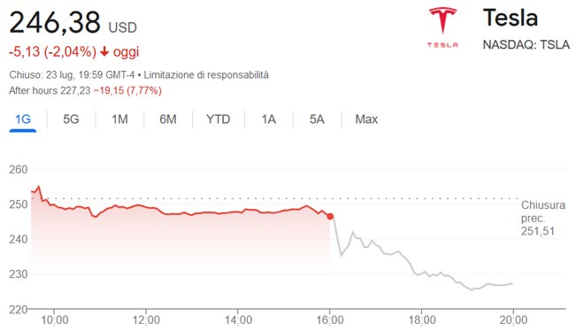 Il titolo TSLA ha registrato un calo del 2% alla chiusura delle contrattazioni e del 7,7% durante l'after hours.