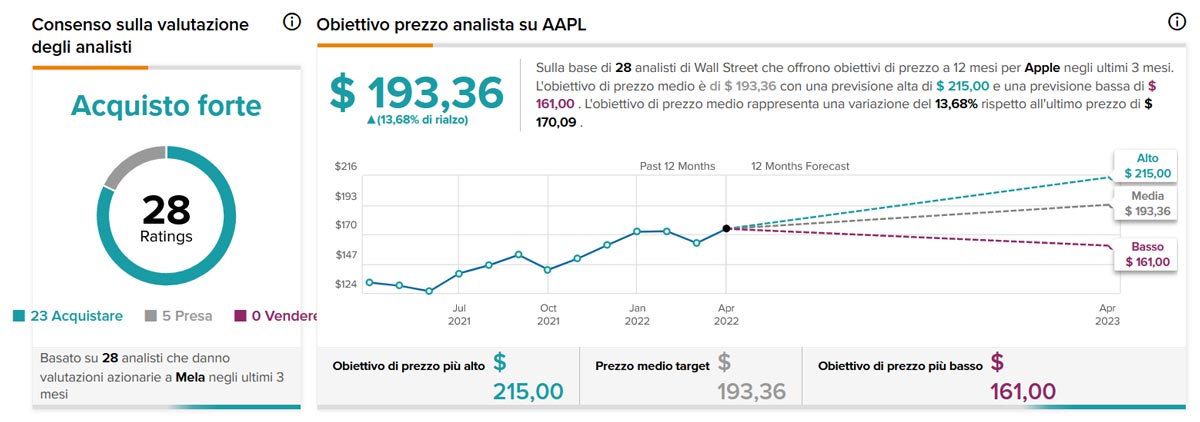 Gli analisti hanno anche un debole per Apple, consigliandolo come acquisto forte con un prezzo medio di 193,36 dollari, un potenziale aumento del 10,67% rispetto al prezzo più recente di 174,72 dollari.