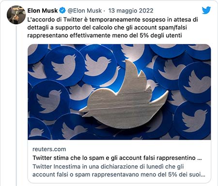 Musk si è collegato a un precedente articolo di Reuters che ha evidenziato il fatto che la direzione di Twitter ha affermato nel primo trimestre che una revisione interna ha rilevato che account falsi o spam rappresentano solo il 5% circa degli utenti attivi giornalieri dell'azienda.