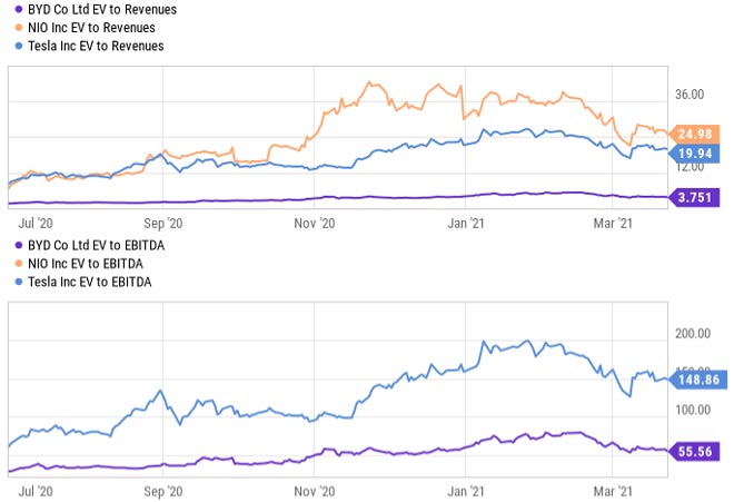 Anche oggi, dopo l'aumento esponenziale del suo investimento, Buffett probabilmente deve ancora apprezzare la valutazione rispetto ai rivali di BYD. Dopo l'enorme corsa ai produttori di veicoli elettrici nel 2020, nessuno di loro può essere considerato economico secondo le misure tradizionali. Ma BYD confronta molto favorevolmente i ricavi del valore aziendale o l'EBITDA, rispetto sia a Tesla che a NIO.