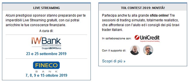 La novità dell'edizione 2019 è il Tol Contest, un'iniziativa didattica che, direttamente sul sito della Trading Online Expo (https://tolexpo.borsaitaliana.it/trading-online-expo-2019/), permette di arricchire le conoscenze di Borsa e trading e di metterle alla prova in modo sicuro e divertente. Prestigiosi trader faranno da coach, mettendosi a disposizione degli utenti tramite video, documentazione, incontri in Live streaming, per prepararli al meglio alle gare, che si svolgono online a partire da lunedì 30 settembre. Mediante l’utilizzo di un simulatore di trading, molto semplice ma assolutamente realistico, verrà ripercorsa in 30 minuti, una intera seduta di Borsa. Gli utenti potranno eseguire operazioni di acquisto o vendita, valutare il grafico dei prezzi e applicare le conoscenze acquisite. Durante le gare, il commento Live dei coach renderà ancora più avvincente la competizione.