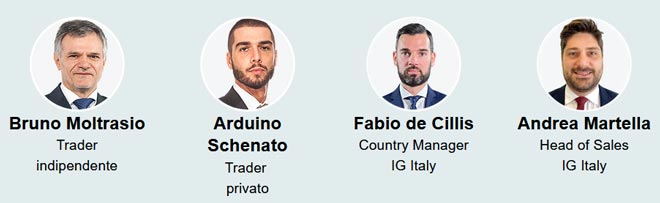 Gli incontri vedranno la partecipazione di trader professionisti come Bruno Moltrasio e Arduino Schenato che metteranno a disposizione dei partecipanti le loro competenze e la loro expertise all’interno delle sessioni operative di live trading. A illustrare le potenzialità della piattaforma di IG e degli strumenti messi a disposizione degli investitori ci saranno Fabio de Cillis, Country Manager IG Italia e Andrea Martella, Head of Sales IG Italia.