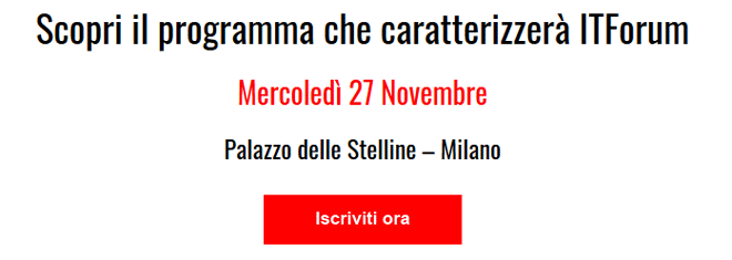 Dopo il successo dell'edizione 2018 ITForum torna a Milano. L’appuntamento è di quelli da segnare in rosso sul calendario, mercoledì 27 novembre 2019 al Palazzo delle Stelline a Milano.