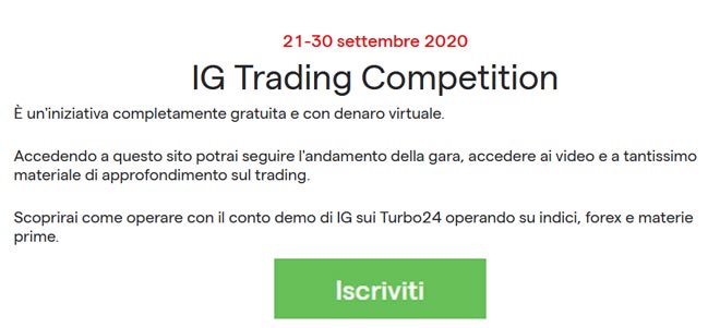 L'evento, altamente formativo, è totalmente gratuito. Ulteriori informazioni sono disponibili sul sito: https://ig-trading-competition.traderlink.it/settembre2020/